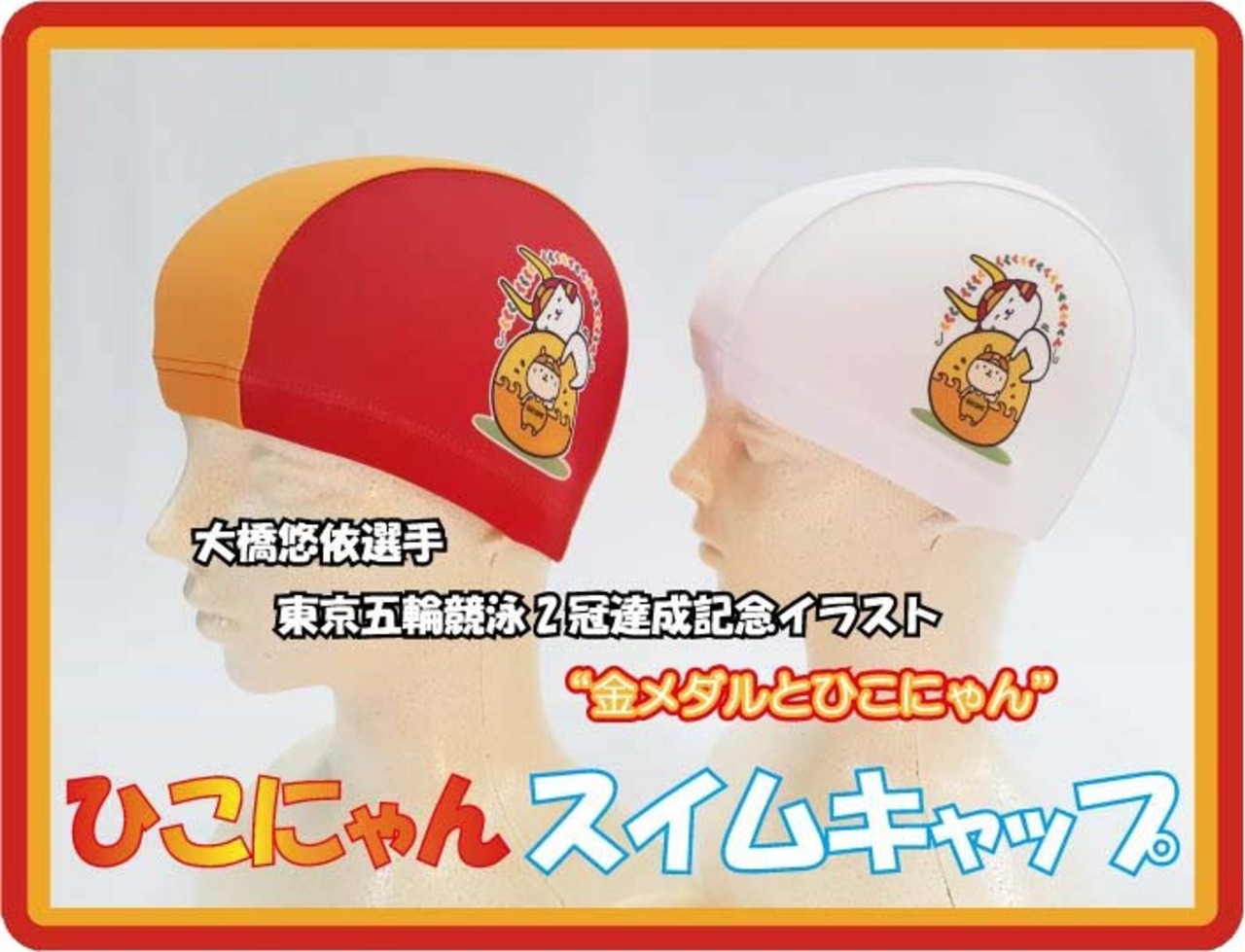 東京オリンピック競泳で2冠を達成された地元彦根市出身、大橋悠依選手の快挙を祝う「ひこにゃん」新イラスト“金メダルとひこにゃん”をプリントした、『ひこにゃんスイムキャップ』です。
